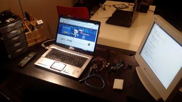 Si quieres entrar en electrónica de hobby, necesita un buen lugar donde puedes derramar todos sus componentes y manos a la obra. Compré este escritorio negro elegante de Walmart como parte de un conjunto. Creo que el conjunto costo total $70, por lo que el escritorio sí mismo es cerca de $40 o así. Aviso que tenemos espacio para un portátil, un poco de espacio para hacer algunos retoques, un monitor para el ordenador (porque dos pantallas es mucho mejor que uno) y una lámpara de escritorio que nos dé cierta iluminación.