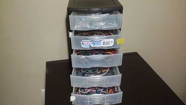 Usted también notará un compartimiento de almacenamiento en el escritorio también. Este compartimento alberga algunos cables de puente. Los cables de puente son útiles para hacer las conexiones entre diferentes partes de tu circuito sin tener que cortar cables. También se incluyen algunos LEDs de varios colores (luz visible, IR). LEDs terminan encontrando en proyectos de electrónica más típicamente como una especie de indicador de un evento que ocurre en su circuito.