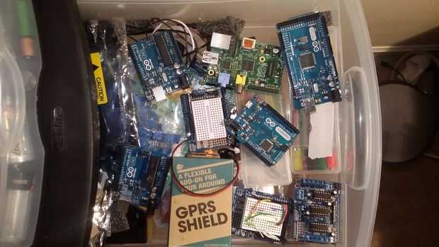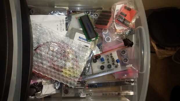 He intentado dividir mis cajones en categorías, pero finalmente se quedó sin espacio así que todo es un poco allí juntos. En un cajón, puedes ver algunas cosas de Arduino y un Raspberry Pi. Quieres tener un microcontrolador de algún tipo, tal vez una versión específica de elección. Para mí, es el Arduino. Son fáciles de usar y hay una tonelada de ayuda en línea si alguna vez sale pegado en algo. Como se puede ver, tengo algunos escudos Arduino, una cabeza de programación para Arduino Pro Mini, algunos mini breadboards y un montón de otras cosas. Usted se encontrará comprando unos complementos de Arduino para sus proyectos.