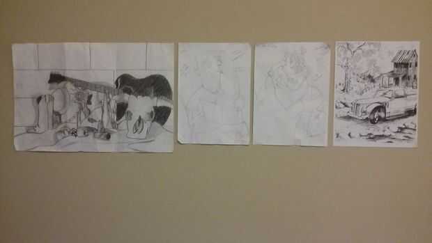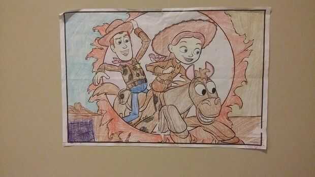 Necesita una pequeña decoración en su espacio de trabajo para iluminar el lugar un poco. Tengo unos dibujos que mi hermana pequeña para mí y algunos que yo mismo dibujé. Incluso compré una obra de arte de un hombre sin hogar que conocí unos meses---no es broma. Es el uno con el coche viejo y granero. Es muy bonita.