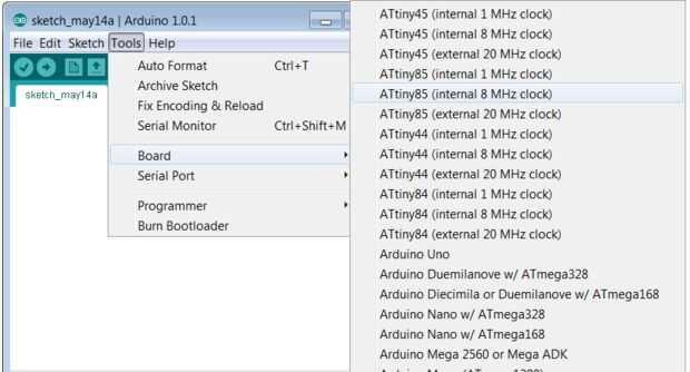 - [Herramientas] -> [tableros] -> seleccionar la placa de Arduino está utilizando (no el ATtiny).