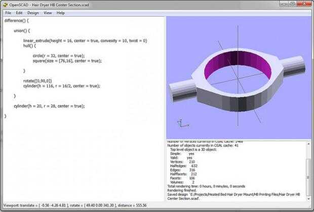 Ahora voy a hacer el agujero para el pelo secador.  Voy a usar difference() para restar un cilindro que tiene un diámetro de 56mm (radio de 28mm) de la Unión que acabo de hacer... con difference(), puede restar tantos objetos que desee de un objeto.