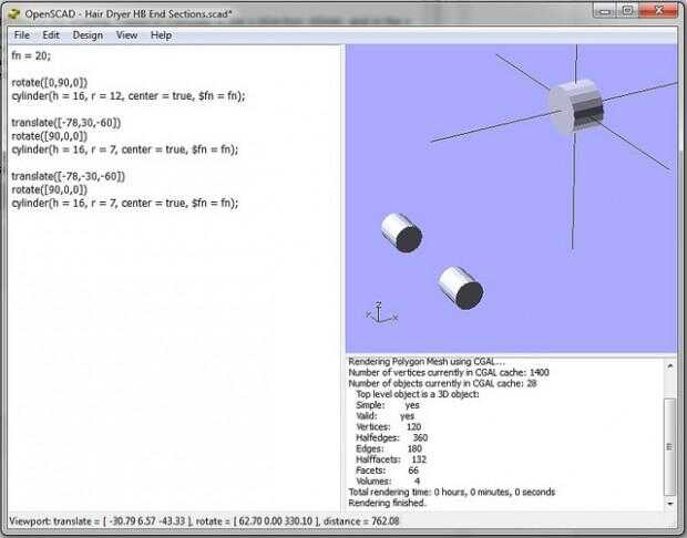 Bien... Quiero dos de estos cilindros, y quiero al espacio a través del eje y centrado en el plano x-z... Así que, voy a añadir un valor y a la traducción de este cilindro añadido recientemente y luego copiar y pegar todo, invertir el signo del valor y de pegada traducir-girar-bloque de código... y voy a ellos espacio 60mm centro a centro (dimensión arbitraria). Por lo tanto, ambos bloques de código será idénticos, salvo uno tendrá una traducción y de 30mm y el otro será-30 mm.