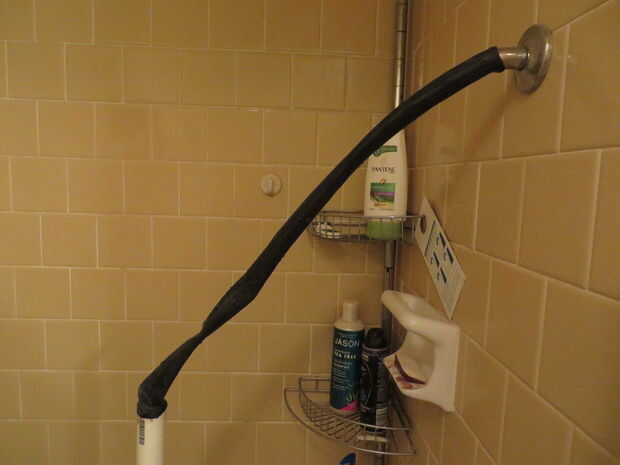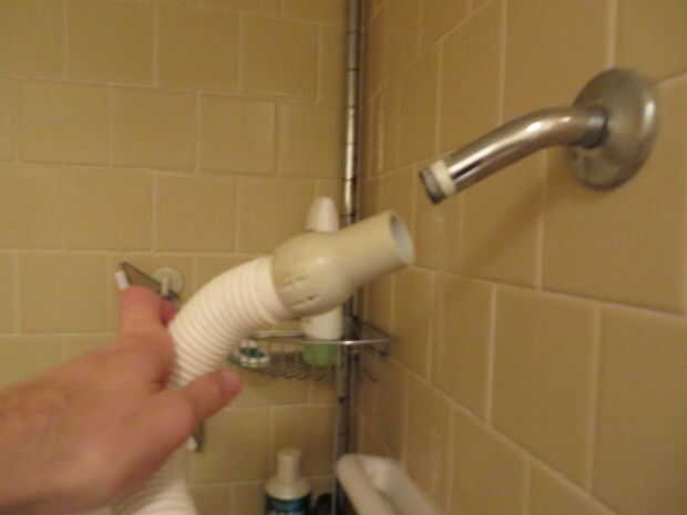 7) con una mano fijar el tubo interior a la tubería de la ducha, es un diámetro más fino que el pvc y el tubo interior no permanece por sí mismo.