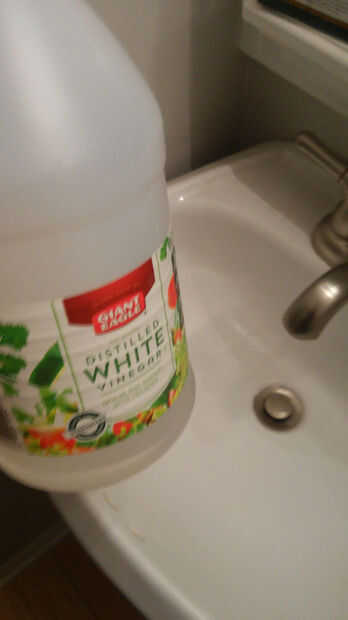 Objeto de dumping alrededor de 1/2 taza de vinagre el fregadero. Entonces rápidamente cubriendo la abertura del fregadero con un vaso para mantener la reacción de bicarbonato de sodio y vinagre de la explosión en el fregadero.