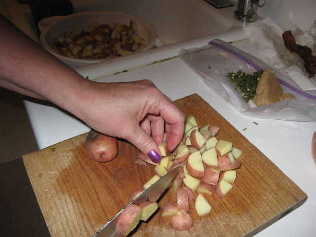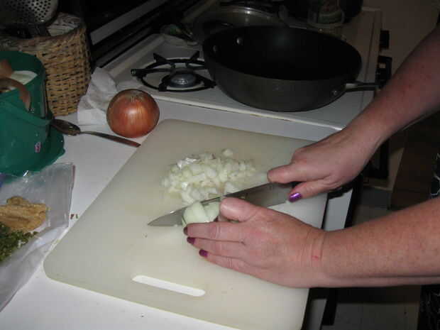 Así que ahora quiere cortar las patatas y las cebollas, también cortar el ajo. Como se puede ver en la imagen que ya teníamos el ajo tajado para arriba en un bloque congelado junto a algunos chiles serranos decidimos experimentar con.