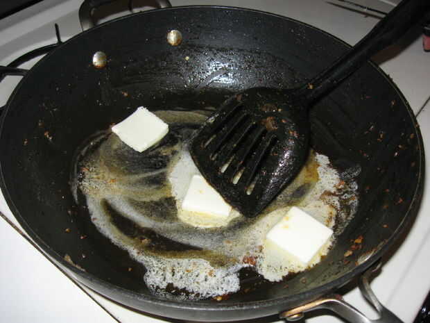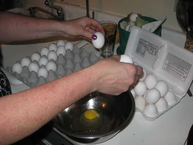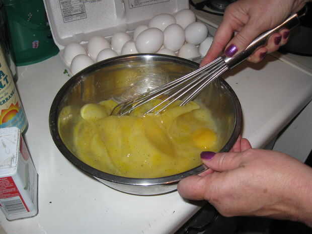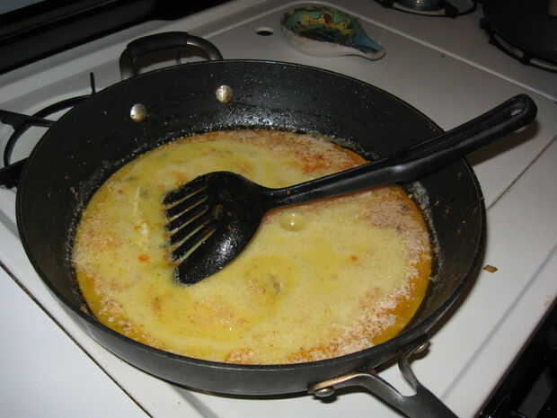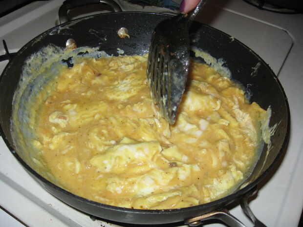 Ahora usted quiere obtener todos los huevos y crack em en un tazón. Agregue sal y pimienta y mezclar todo. Entonces ponen mantequilla en su pan y revueltos los huevos.