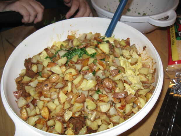 todo lo que necesitas para hacerlo es: 12 huevos (alimenta cuatro personas con izquierda sobre huevos) sal, pimienta, 1 libra de salchicha y queso.Paso 1:Crack los 12 huevos en un tazón.huevos de 2:Mix de paso hasta que todos se mezclan la sal y pimi