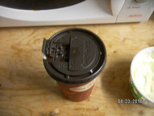 y... aquí... que... ir...Un Extra grande papel café de Tim Horton--(donde ella puso todo)Y, un altavoz de agudos de un viejo sistema de altavoces, que necesita una fuerza de concentración, un.. .esperar pues... Megáfono, oh tal vez que es más una ide