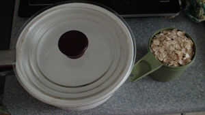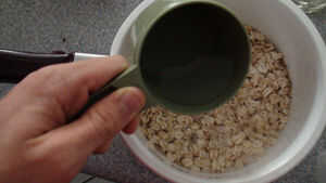 este es un muy simple avena para el desayuno. Esto también puede ser una buena comida antes del ejercicio.Lo que usted necesita:Un tazón de fuentetaza de avena o 1 dl1 plátano2 cucharadas de Queso Cottage1 cucharada de paté de hígado1 cuchilloLecheCa