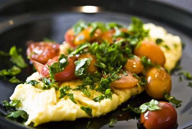 Retirar del fuego y verter los tomates con su aceite encima de la tortilla. Decorar con perejil fresco picado y servir.