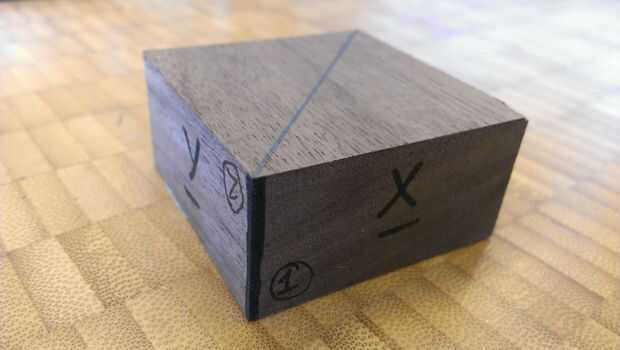 5. ahora es el momento para garantizar su material a la cama. Seleccione un borde vertical en el material y trazar una línea de esquina a esquina. Porque es un cuadrado perfecto, ayuda a añadir un x e y en las caras o un 1 y 2 en las esquinas de origen.