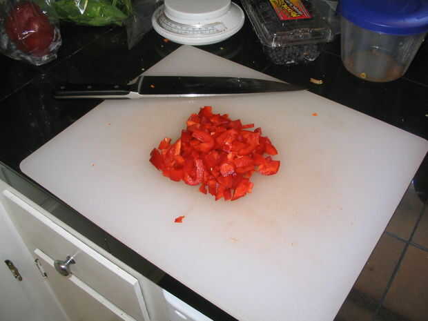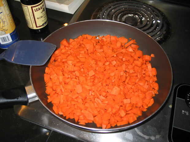 Iniciar las zanahorias, saltear en aceite de canola y picar un pimiento rojo.