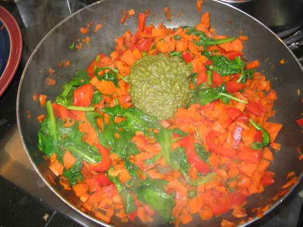 Añadir algún pesto. Mina obtuvo dos cucharadas colmadas de Ciba Naturals Pesto (de Costo). Pesto casero, fresco sería aún mejor. Una vez que has mezclado en el pesto, apartar las verduras y preparar la bandeja para huevos.