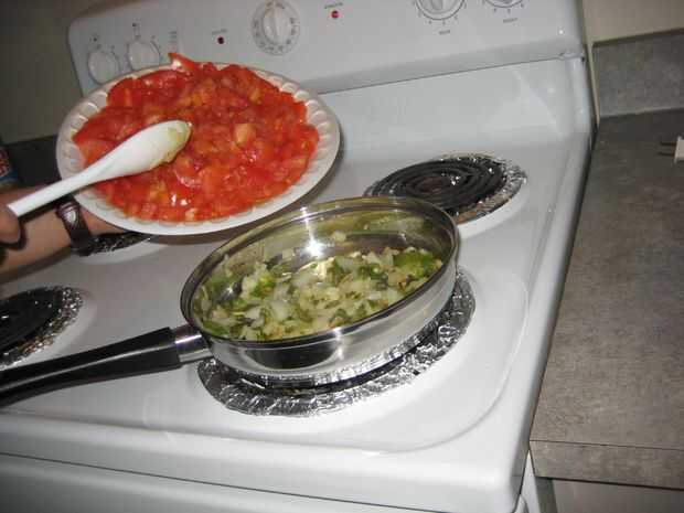 Pour la ya golpeada tomates en la mezcla y seguir revolviendo, hasta que se evapora el jugo de los tomates a la mitad y los tomates se convierten en más suave.