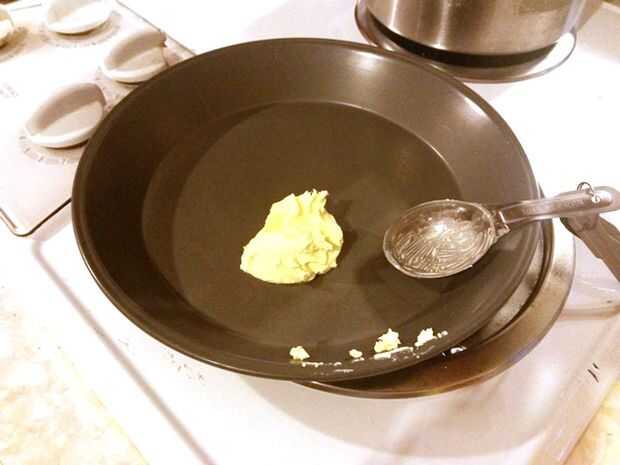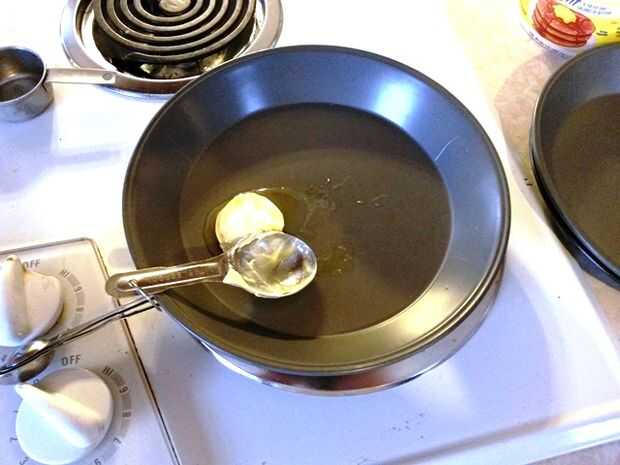 Coloque 1 cucharada de mantequilla o margarina en cada bandeja. Si utilizas una sola gran sartén Coloque dos cucharadas en una sartén. Coloque la bandeja en el horno para derretir la mantequilla y precaliente la sartén.