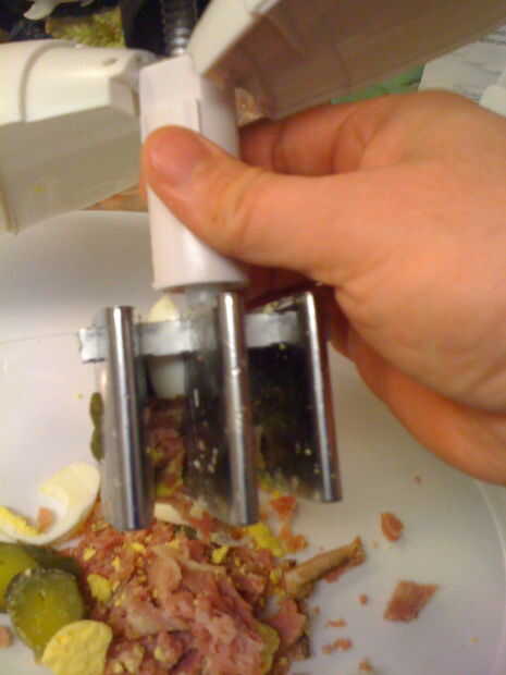 Varios pedacitos de jamón, cocido, yema de huevo y pepinillo fueron pegados a las varias partes de las hojas de Slap Chop.