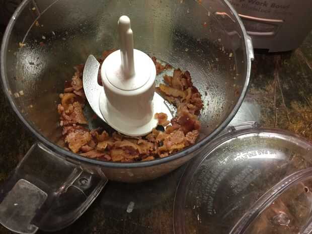 Inicio el bakon en la bandeja de cocina y cortar con un cuchillo. Estoy usando este procesador de alimentos para ayudar a acelerar la broca backon, proceso de fabricación.