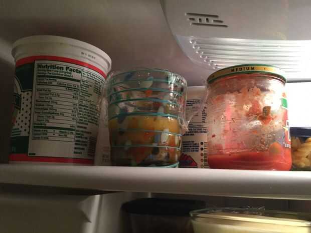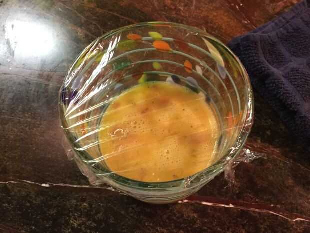Poner plástico sobre la parte superior de la taza y ponerlo en el congelador listo para la mañana. También, poner la espátula y la cacerola en la estufa lista para ir.