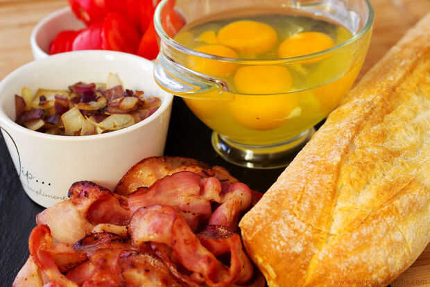 Desayuno el barco con queso, tocino y tomates (1 / 3 paso)