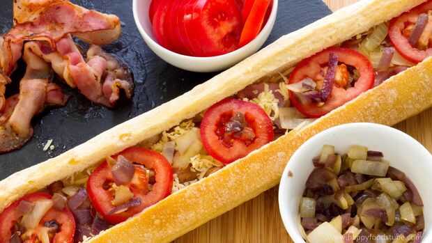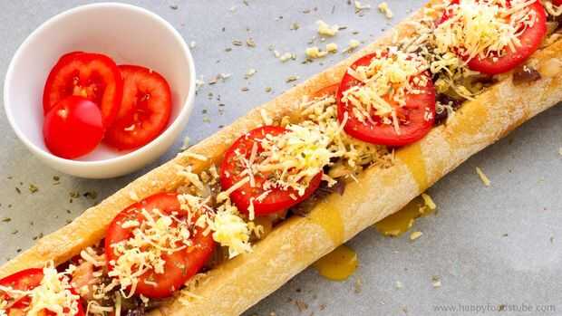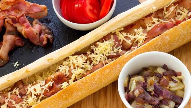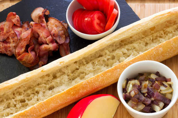 4. rallar o rebanar el queso. Trocear las cebollas y tomates. Una vez que terminaste con la preparación, tomar la baguette y comenzar a añadir los rellenos: queso, tocino, tomates. Acabar con algo más de queso.