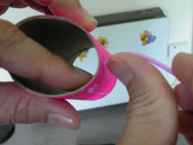 • Elegir un tubo de rollo y pasar el palo de brote de oído a través de un conjunto de agujeros hechos en el paso 1. Para hacer esto, pase un extremo del palo a través del primer agujero, doblar el palo ligeramente dentro del tubo con el dedo y tratar de llevar el palo por el segundo orificio