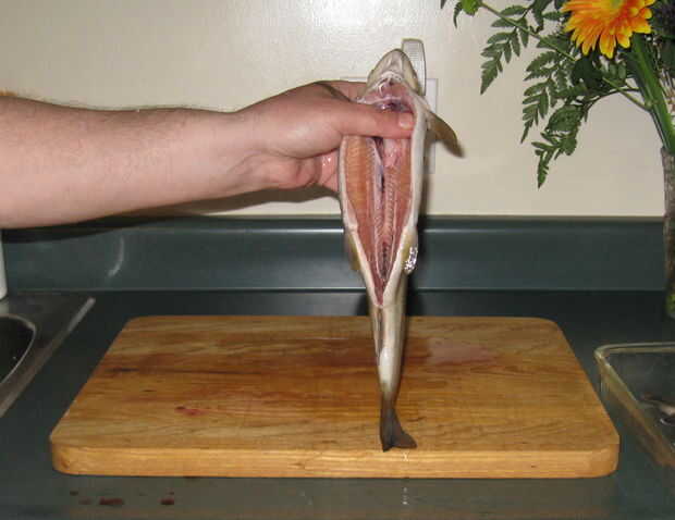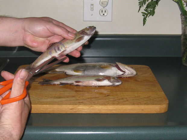 Raspe el interior de los pescados hacia fuera y enjuagarlos en agua fría.