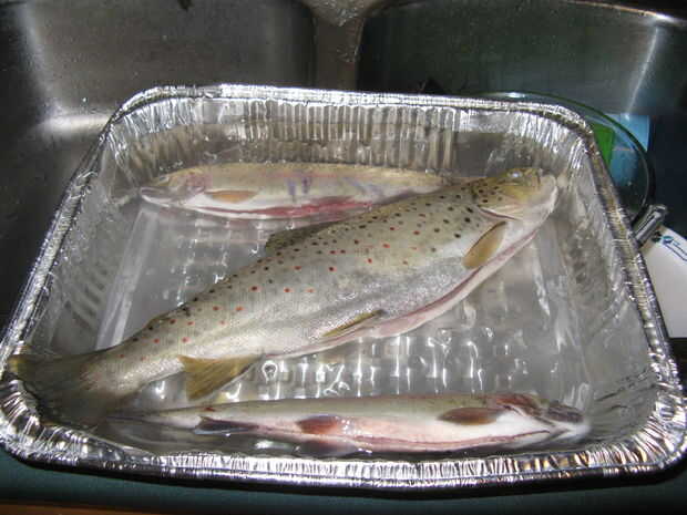 Cuando la trucha es destripada colóquelas en un recipiente de agua fría para obtener la sangre de la carne. Usted puede decir cuando la sangre está fuera de la carne cuando las branquias van de rojo a blanco o un rosa claro.