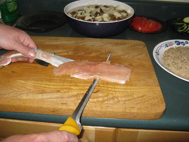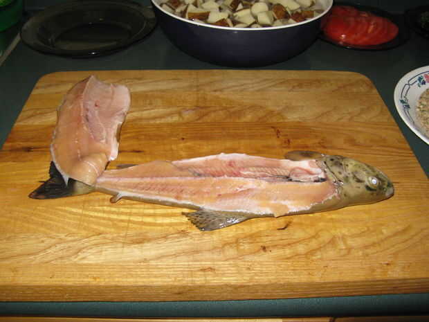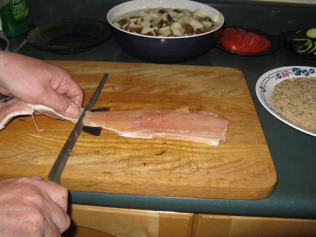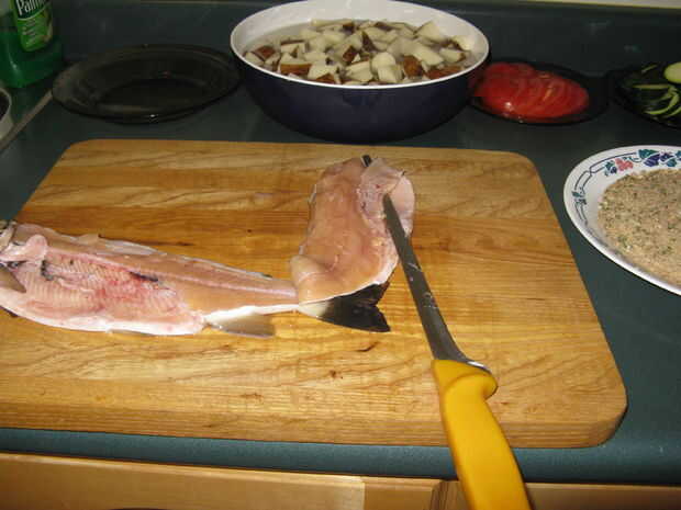 Luego corte a lo largo de la espina dorsal hasta la cola pero no cortar el filete de completamente y no se preocupe si usted toma las costillas con el filete.