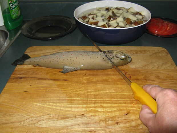 Usando un comienzo cuchillo fino el corte justo detrás del corte de aleta gill a la columna vertebral.