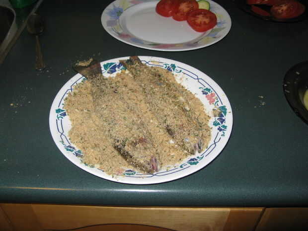 Después de la capa los filetes con huevo les sumergen en las migas de ambos lados de la capa, hacer lo mismo con el pan-fries.