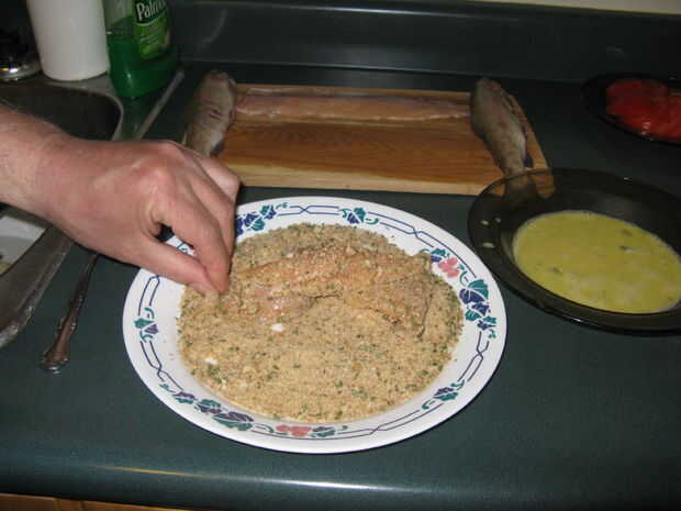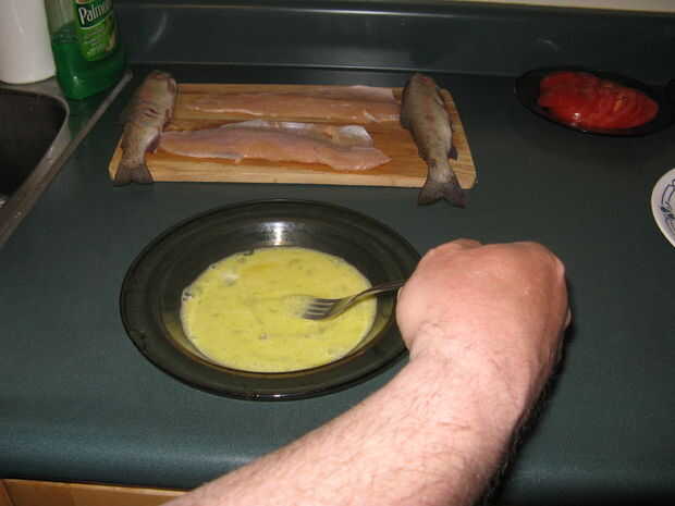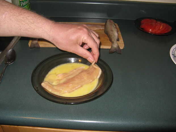 Cuando el pescado es la mezcla seca y huevo en un intestino y dip filetes de pescado en el huevo asegurándose de cubrir ambos lados.