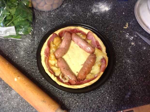 me gusta desayuno inglés completo... y realmente me gusta la pizza así que decidí combinar los dos y hacen una Pizza de desayuno inglés completo!Son los ingredientes necesarios para hacer la pizza:Masa para pizza - almacén comprado o hecho a mano, su