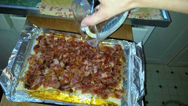 A continuación colocar el tocino. Me parece que rasgando el tocino en trozos tamaño bocado asegura no sólo una aún cubierta, pero amplia de cerdo en cada bocado!