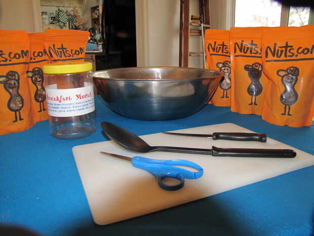 Material: Un recipiente muy grande, un cuchillo pequeño, un par de tijeras (opcionales), una tabla de cortar y una cuchara grande, robusta.