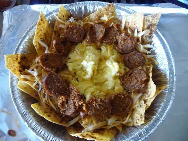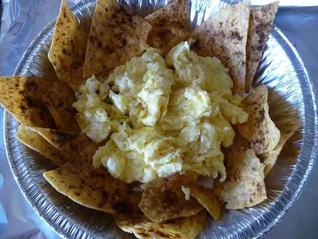 - Espolvorear el queso restante sobre los huevos, chorizo y tortillas.