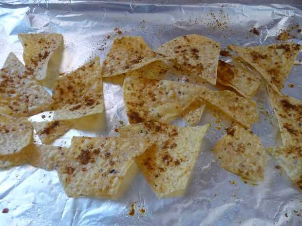 Los totopos son especialmente aderezados para adaptarse a este plato. Todo lo que necesitas es aceite en aerosol y sazonador de Taco. La técnica de receta fácil peasy puede encontrarse aquí: