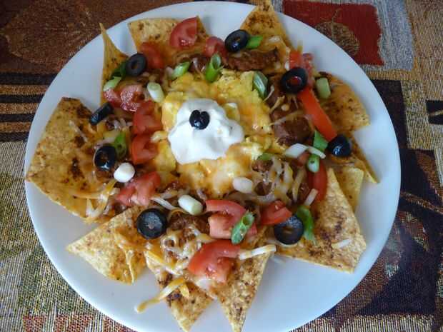 Guarniciones: Picados frescos aguacates, tomates y cebollas verdes, rebanadas de aceitunas negras y crema agria.