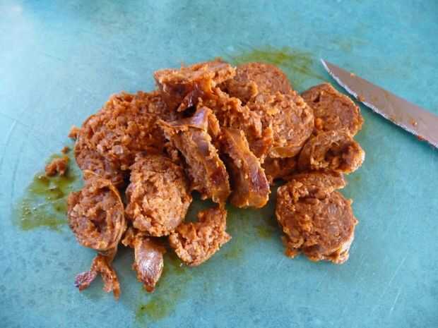 Cocine el Chorizo según el paquete. Johnsonville pone hacia fuera un buen producto. Es suave pero sabroso... y hay otras maneras de darle vida a este desayuno... (con Tabasco) si usted está tan inclinado. Cuando el Chorizo esté completamente cocinado, dejarlo enfriar y cortar en rodajas.