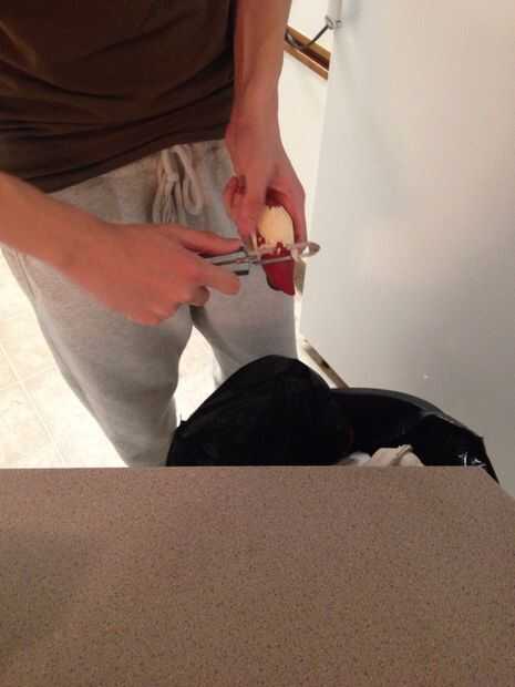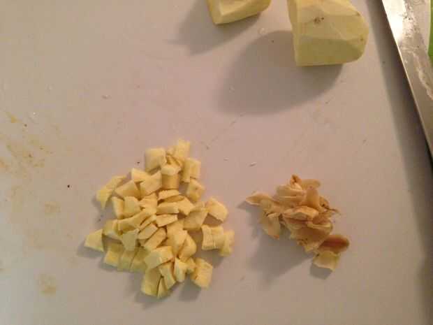 En cuanto a pelar simplemente utilizar un pelapapas. Son realmente baratos y generalmente no más de un par de dólares en el mercado/supermercado. Son más fáciles de usar que un cuchillo de cocina para quitar la cáscara y no tener que preocuparse por perder la 'carne'. Después de pelar el camote, deberá cortar en algunos trocitos.