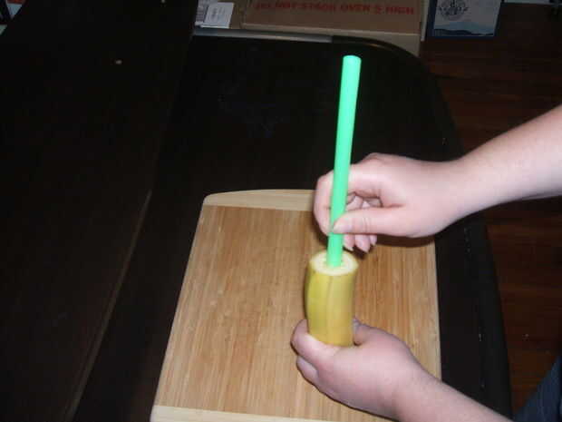Con la paja, ahuecar con el plátano. Asegúrese de dejar suficiente de las paredes de plátano leche y cereal. Si usted perfore los lados, debe comenzar de nuevo.
