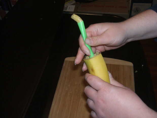 Si hueco el plátano correctamente, las partes innecesarias de la fruta se alimentan bien a través de la parte superior de la paja.