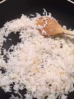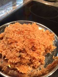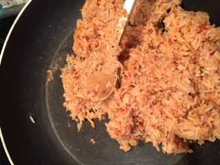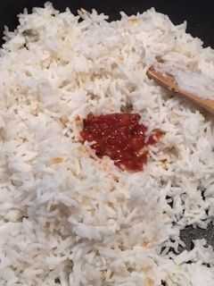 Mezcle el arroz y la salsa de tomate y carne asada. Añadir la sal y pimienta agrietada y cocer un poco hasta que el arroz se tipo de pegajoso.