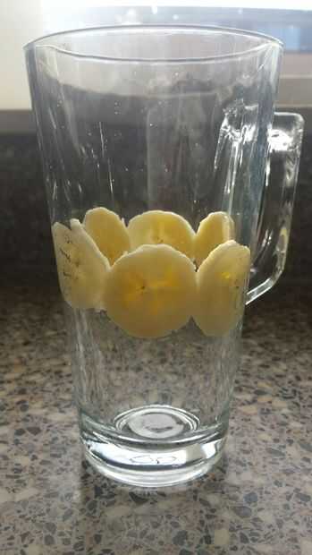 Por cortar el plátano en pequeñas capas te darás cuenta que se adhieren muy fácilmente. Les Coloque suavemente en el vidrio.
