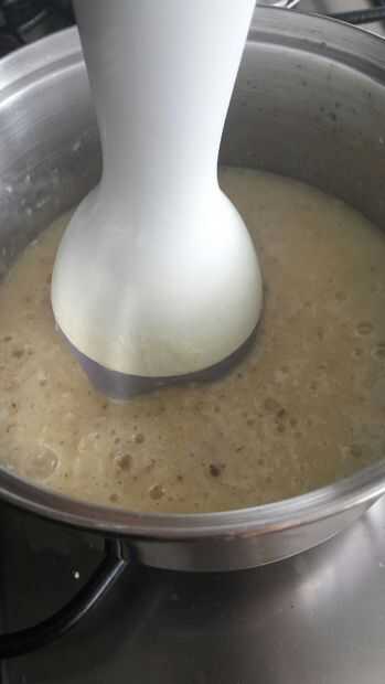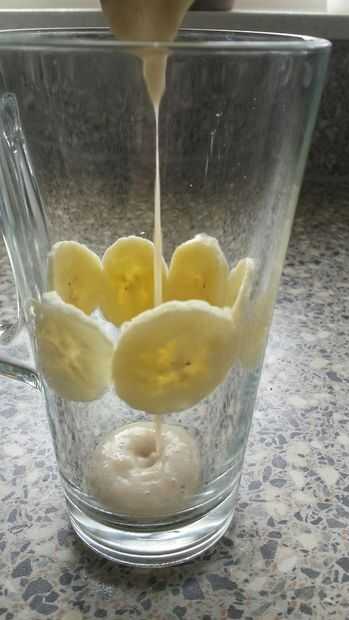 Poner el Cocoleche, rodajas de banana (guarde algunas para rematar si quieres), coco rallado, algunas nueces y un poco de agua en una cacerola o tazón de fuente, el puré lo hasta que se convierte en una papilla de textura.
