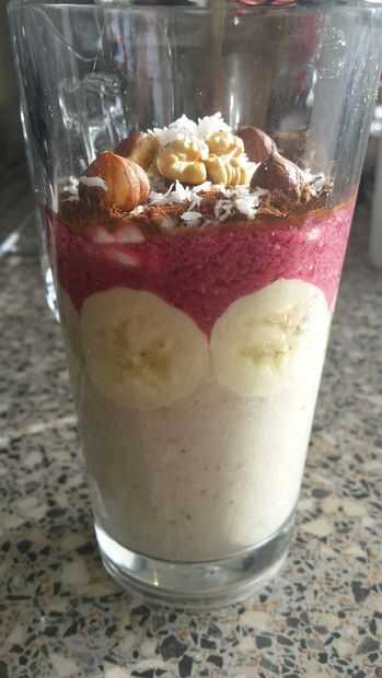 Ahora eres libre de utilizar cualquier cosa que te gusta. Lo he utilizado de coco rallado, cacaopowder crudo y más nueces. Tratar de crear contraste con los ingredientes. Te ves fresco ;)