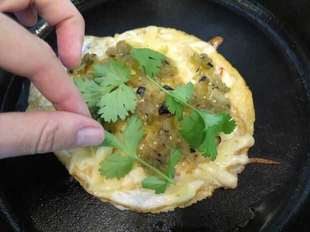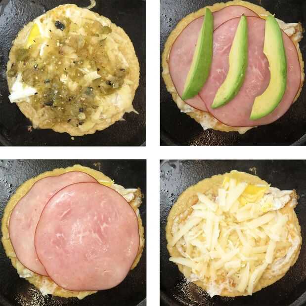 Ahora agrega el queso y cualquier otros rellenos que haya decidido utilizar. He hecho unas cuantas versiones diferentes con estos ingredientes, pero creo que mi favorita tenía jamón, queso, salsa y cilantro dentro y aguacate como adorno.