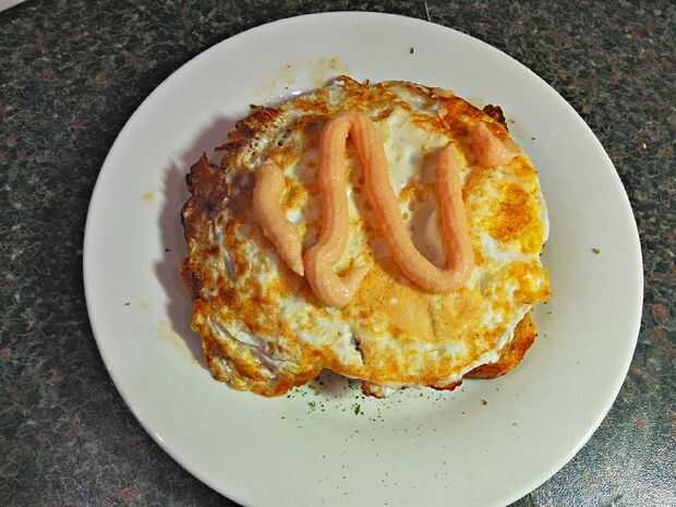 Uno de mis aperitivos favoritos en cualquier momento del día. Tan simple, pero usted puede Agregar extras lo que usted quiere.Ingredientes:1 - huevo1 - rebanada de queso2 - rebanadas de pan2 - cucharaditas de mostaza.1 - cucharadita o menos de vinagr