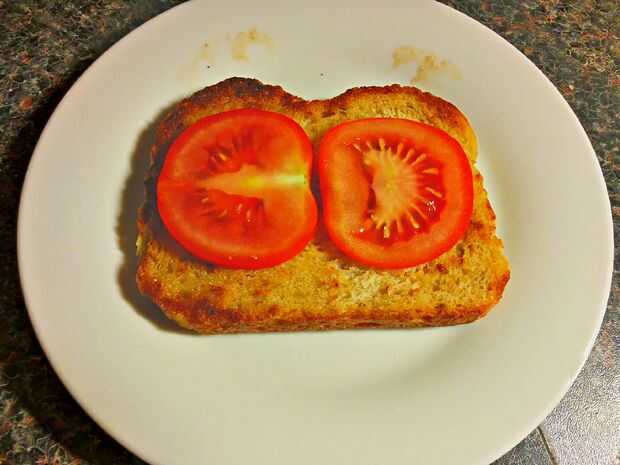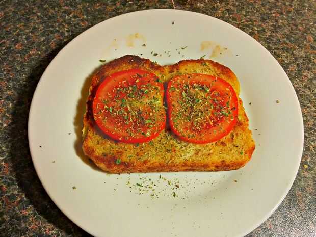 Mientras que el huevo tarda en freír, corta 2 rodajas de tomate. Poner sobre el pan y especias hierbas francesas en ellos.
