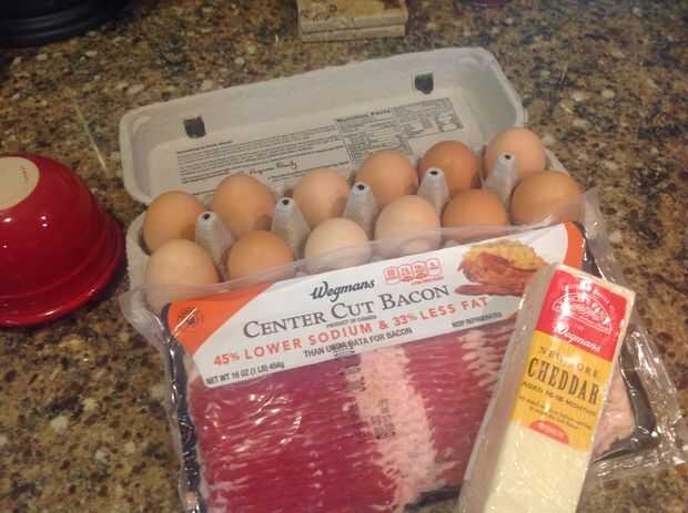 Recoger sus rellenos. Obviamente se necesita huevos, pero el resto depende de lo que quieras. Hemos usado tocino, salchicha, queso cheddar, queso americano, jamón y ahumados de Turquía. Encontré estos huevos de hermosa finca en el día de la apertura de nuestro mercado de granja local ayer. Hoy fue un día de panceta, huevo y queso!